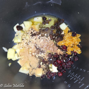 - Die kandierte Orangenschale fein hacken, die Aprikosen (bzw. Pflaumen), Cranberries und Mandeln hacken. Den ½ Apfel vom Kernhaus befreien und sehr klein schneiden.