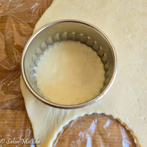 - Die Küche möglichst kühl halten. Ca. ⅔ des Teiges zügig ausrollen. Nicht benötigten Teig wieder in den Kühlschrank legen. Mit dem großen runden Ausstecher Kreise ausstechen und in die Förmchen legen.