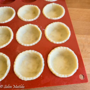 - Alle Förmchen mit Teig auslegen und gut andrücken. Dabei zügig arbeiten und Teig und Förmchen gegebenenfalls immer mal wieder runterkühlen.