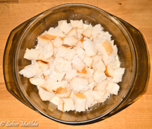 - Das Brot in Quadrate (ca. 2 x 2 cm) schneiden. Die 2 Kondensmilchen in eine Schüssel geben. Das Brot darin einweichen. Dann mit einer Gabel das Brot sehr klein drücken. Es sollte sich fast darin auflösen.